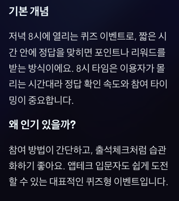 참여 방법이 복잡하지 않고, 잠깐의 시간으로도 포인트를 받을 수 있다는 점이 가장 큰 이유예요. 출석체크처럼 습관화하기 좋고, 광고성 문구나 제품 설명 안에 힌트가 들어 있어 초보자도 금방 익숙해질 수 있거든요. 그래서 앱테크 입문자도 쉽게 도전할 수 있는 대표적인 퀴즈형 이벤트로 많이 언급돼요.