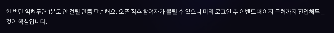 이 흐름이 단순해 보여도 실제로는 오픈 직후 참여자가 몰릴 수 있어서 앱 반응이 느려질 때도 있어요. 그래서 미리 로그인해두고 이벤트 페이지 근처까지 들어가 있으면 훨씬 빠르게 참여할 수 있습니다.