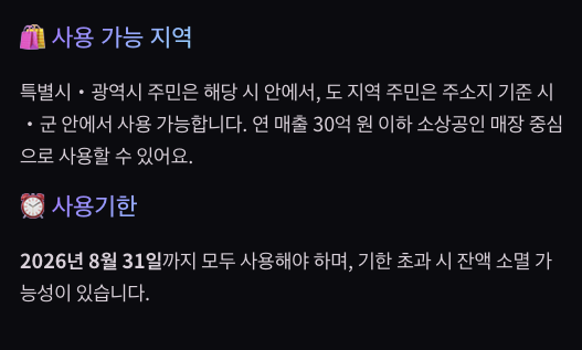 모든 매장에서 자유롭게 쓸 수 있는 건 아니에요. 온라인 쇼핑몰, 배달 앱, 유흥업종, 사행업종, 환금성 업종 등은 사용이 제한됩니다. 겉으로 보기엔 일반 소비처럼 보여도 결제 단계에서 막히는 경우가 있을 수 있어서 업종 제한을 먼저 알아두는 게 좋아요.